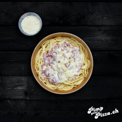 CHF21.00Add to cart300g Spaghetti mit Käse-Rahmsauce, Knoblauch, Zwiebeln und Schinkenstreifen